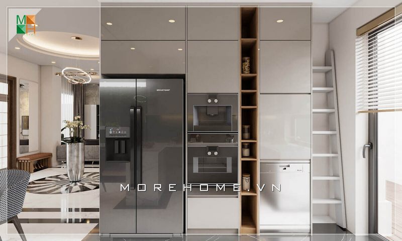 Mẫu thiết kế phòng bếp hiện đại nổi bật với gam màu xám ghi sang trọng cho biệt thự, nhà phố.