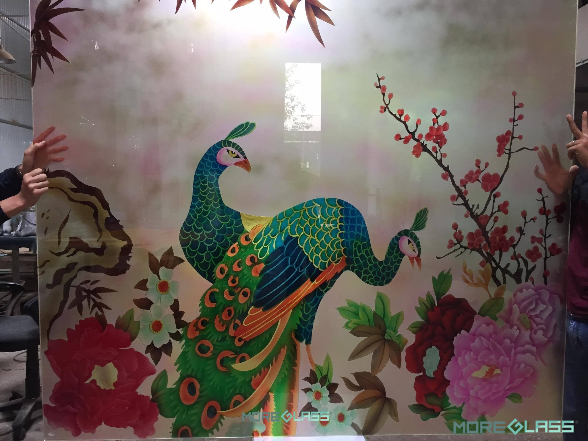 Mẫu tranh kính ốp tường in 3D hình tượng chim công và hoa hồng, vừa mang ý nghĩa phong thủy may mắn tốt đẹp, vừa tạo điểm nhấn ấn tượng cho không gian ngôi nhà của bạn