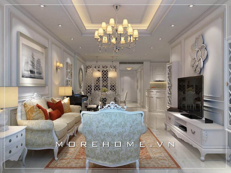 Ghế sofa trong phòng khách được thiết kế theo phong cách tân cổ điển, góp phần nâng cao độ thẩm mỹ của không gian sống của gia đình.