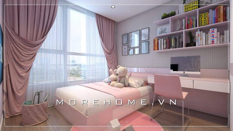 Nội thất phòng ngủ của bé gái được trang trí bằng gam màu trắng - hồng, tạo sự ấn tượng và phù hợp với sở thích của con. Điều này sẽ giúp con có một không gian nghỉ ngơi và học bài tập trung nhất.
