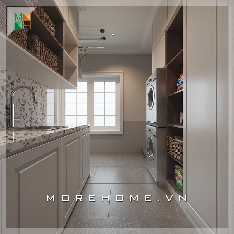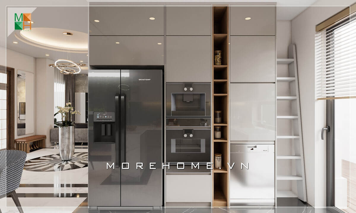 Sẽ là một gợi ý sáng tạo sẽ khiến bạn thích thú như trong ý tưởng bố trí không gian bếp hiện đại biệt thự Vinhomes Imperia Hải Phòng trong đây, thiết kế kệ trang trí ở vị trí gần bàn ăn nhất giúp bạn lấy ly, chén một cách nhanh chóng.