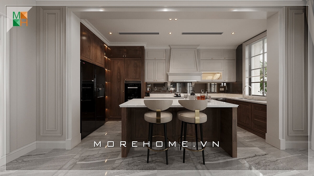 Ấn tượng với mẫu thiết kế tủ bếp đẹp có chút tân cổ điển từ những cái chạm khắc phào nổi của mặt ngoài tủ, nhưng cũng rất hiện đại sang trọng.