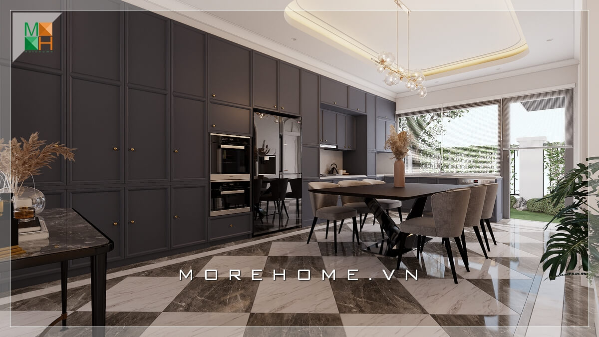 Trang trí phòng bếp đẹp ấn tượng từ phong cách hiện đại sang trọng.