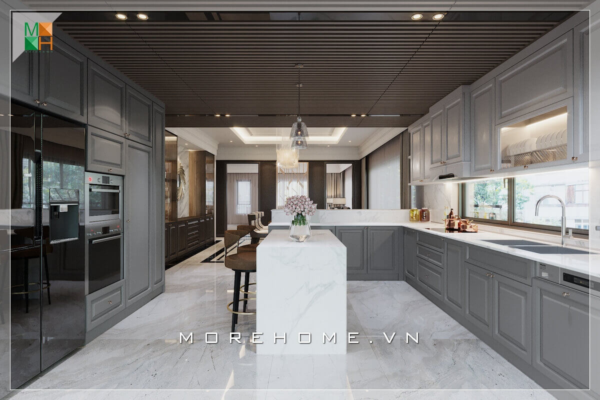 Mẫu thiết kế phòng bếp không gian mở, với hệ thống tủ bếp gỗ kết hợp mặt bàn đá nhân tạo cao cấp với màu trắng - xám, là màu sắc của sự cân bằng, trung tính, mang đến vẻ đẹp sang trọng tinh tế cho không gian phòng bếp