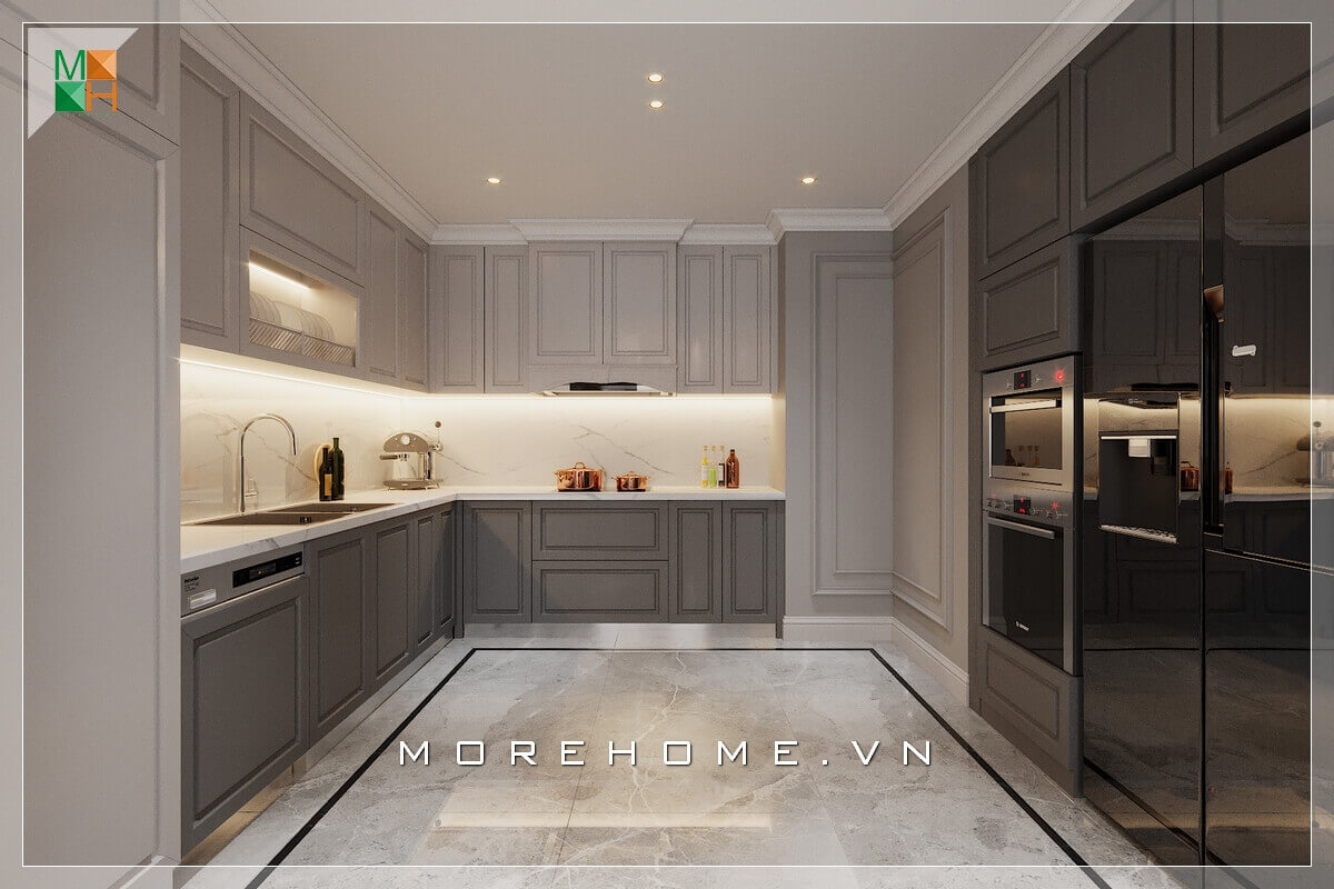 Mẫu thiết kế phòng bếp hiện đại nổi bật với gam màu xám ghi sang trọng cho biệt thự, nhà phố.